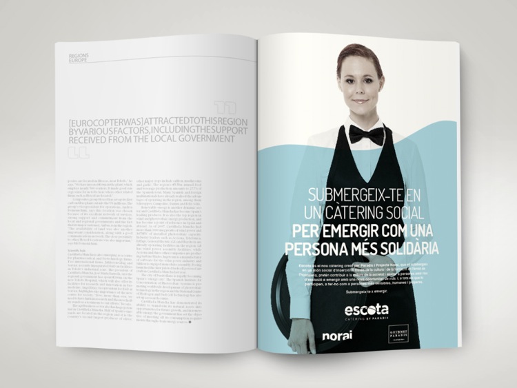 Escota es el nuevo proyecto del Museu Marítim de Barcelona, un servicio de cátering socialmente responsable nacido del proyecto Norai, que ofrece formación en hostelería y restauración a personas en riesgo de exclusión social. El objetivo de la agencia ha sido desarrollar un planteamiento estratégico, bajo el concepto “sumérgete en un proyecto social y emerge como una empresa con valores”, y un plan de comunicación para dar a conocer este nuevo proyecto y ayudar a que sea un éxito. El reto era crear una marca de ilusión dentro del ámbito de la responsabilidad social y que se diferenciara del resto de ofertas.